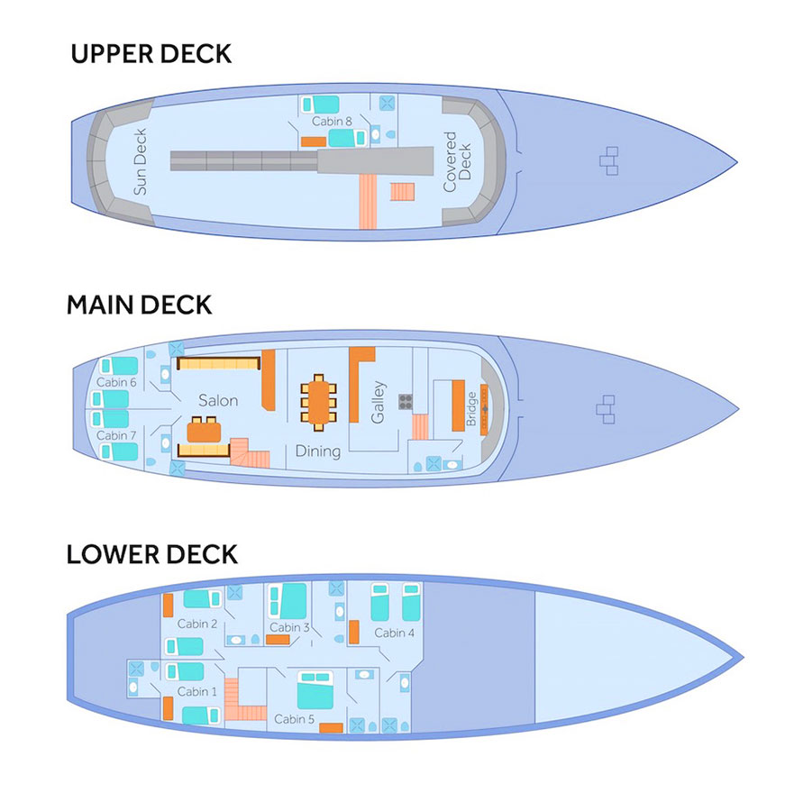 Crew: All crew are fully trained and certified. Captain, multilingual naturalist guide, cook, 2 engineers, barman, and 4 sailors.