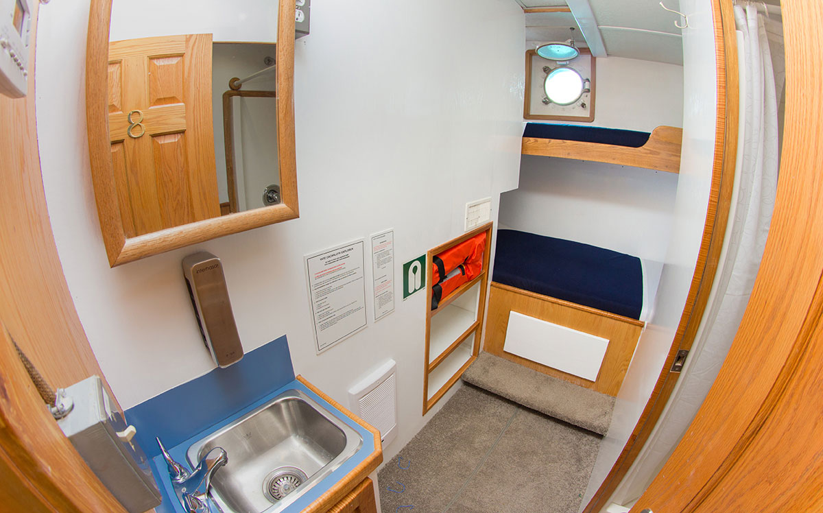 Guest Accommodation: 8 cabins each with private bath. Hot / cold water showers. Combination of Queen, Double and Twin sized mattresses.
