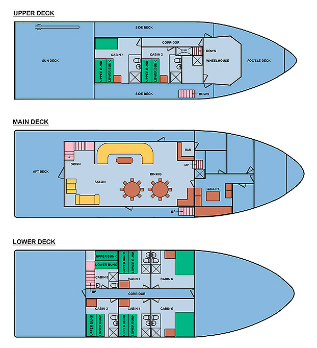 Crew: All crew are fully trained and certified. Captain, multilingual naturalist guide, cook, engineers, barman, and 4 sailors.